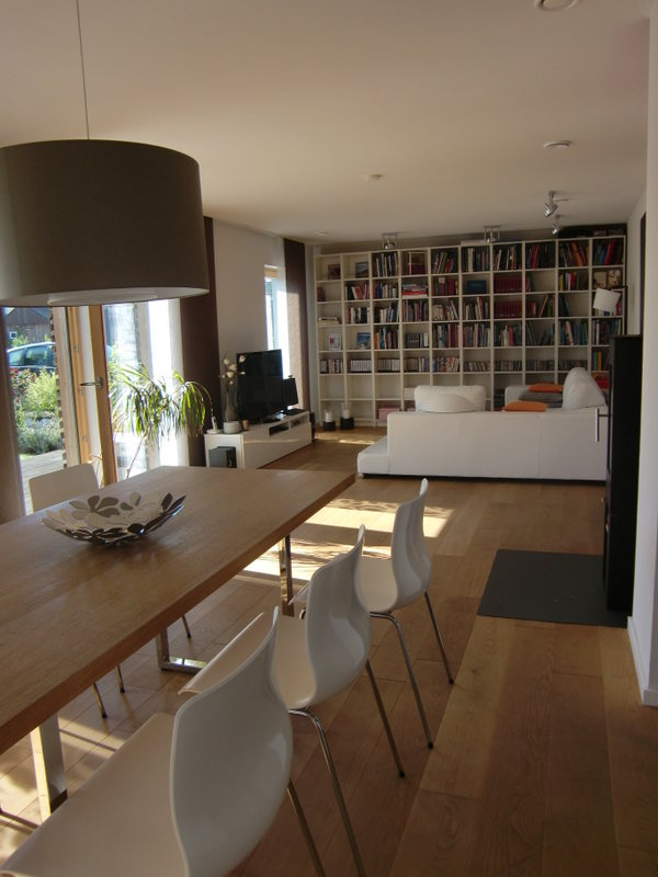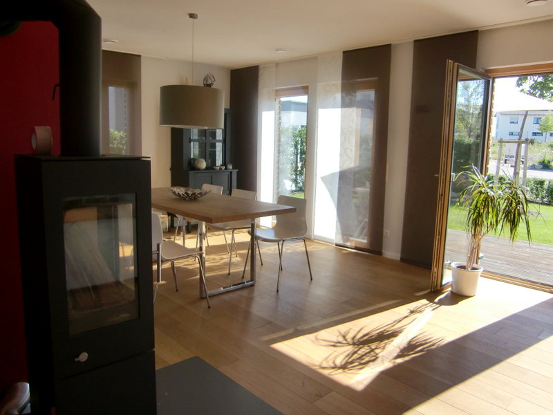 Allmilmö-Einbauküche, Wohn-Esszimmer mit Q-Bic-Attika-Holzofen,